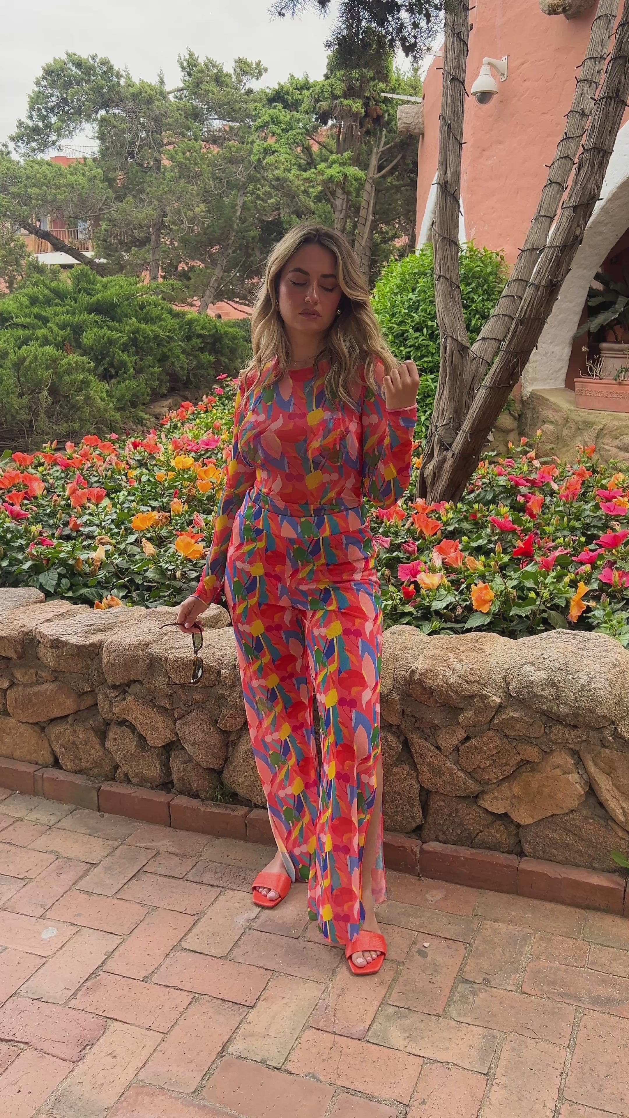 Esplosione di colore e vitalità in movimento. Il Pantalone Cherry è un capo statement che unisce comfort e stile, grazie al suo tessuto semitrasparente con elastico interno morbido e leggero che danza con il corpo. La fantasia è un cocktail vitaminico di frutti tropicali, foglie esotiche e accenti fioriti, declinati in toni vibranti di ciliegia, lime, arancio e fucsia.
